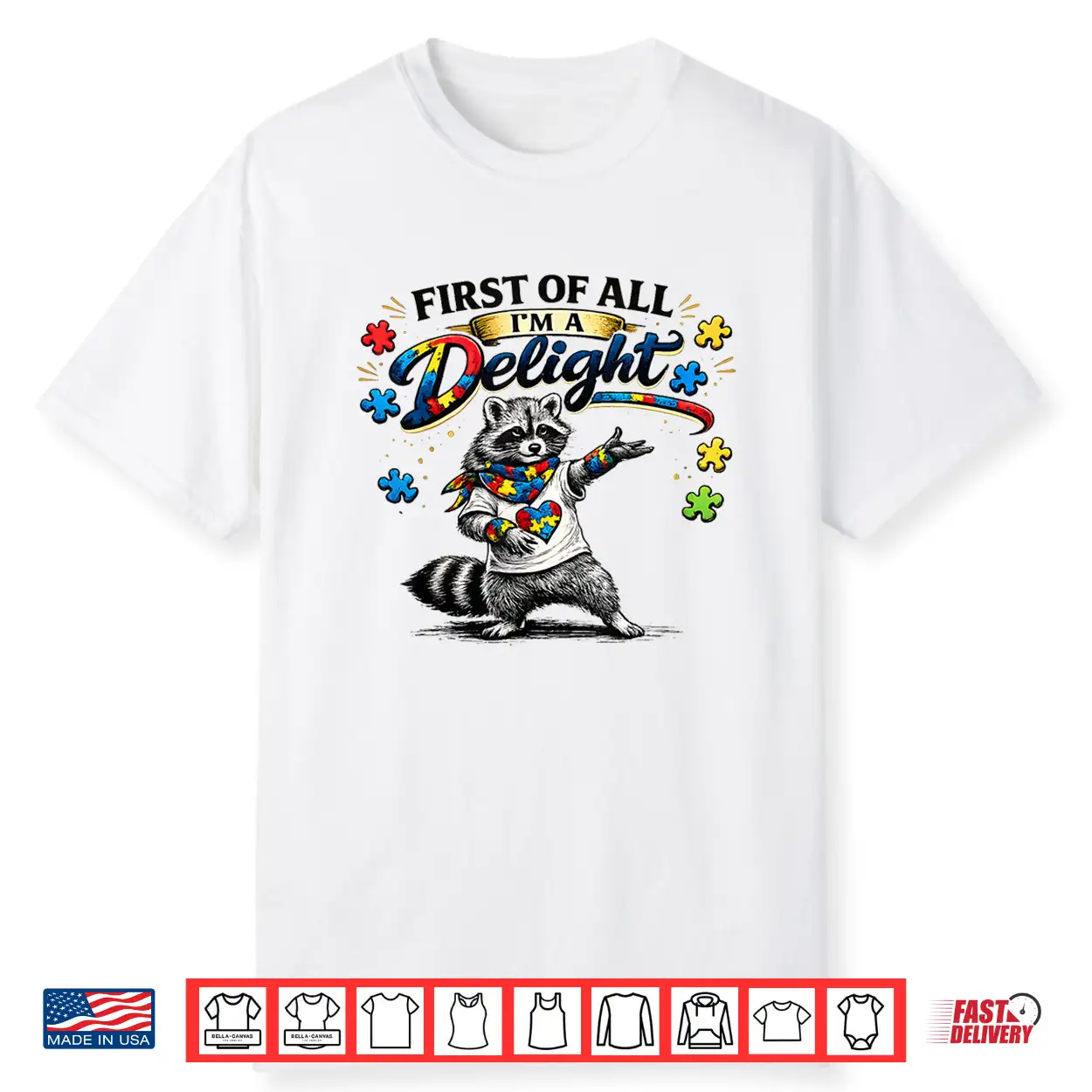 First Of All I Am A Delight Funny Raccoon Autism Awareness Shirt